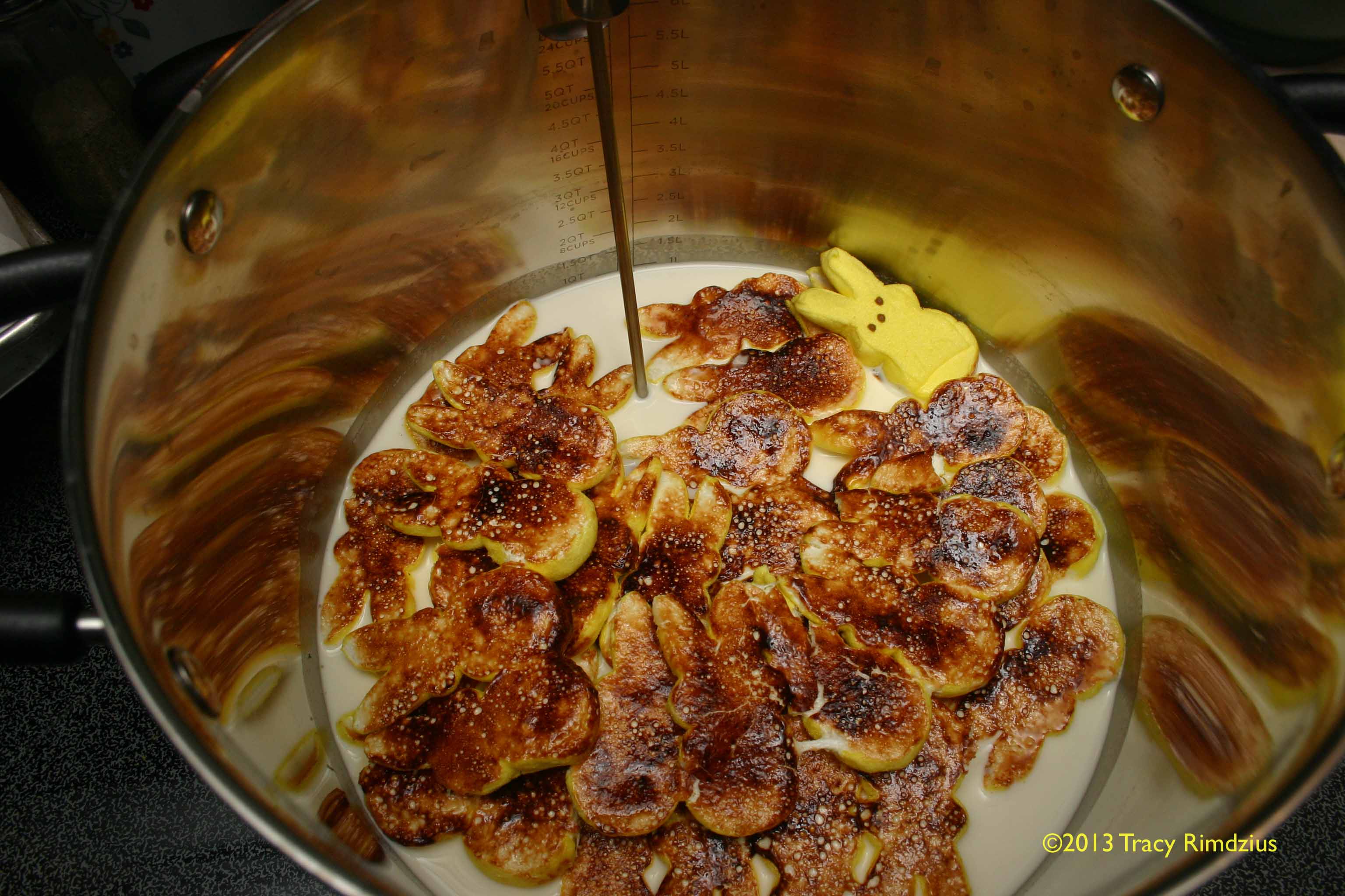 For me, Easter is a time of renewal and peace…and mutilation of Marshmallow Peeps. My first “stab” at ice cream recipe development was the Marshmallow Peep Ice Cream I made for Easter last year. Many Peeps lost their lives in that effort; some drowning in the boiling dairy mix, and others getting chopped into pieces for the finished ice cream. Again this year, Peeps were hurt in the making of my ice cream.