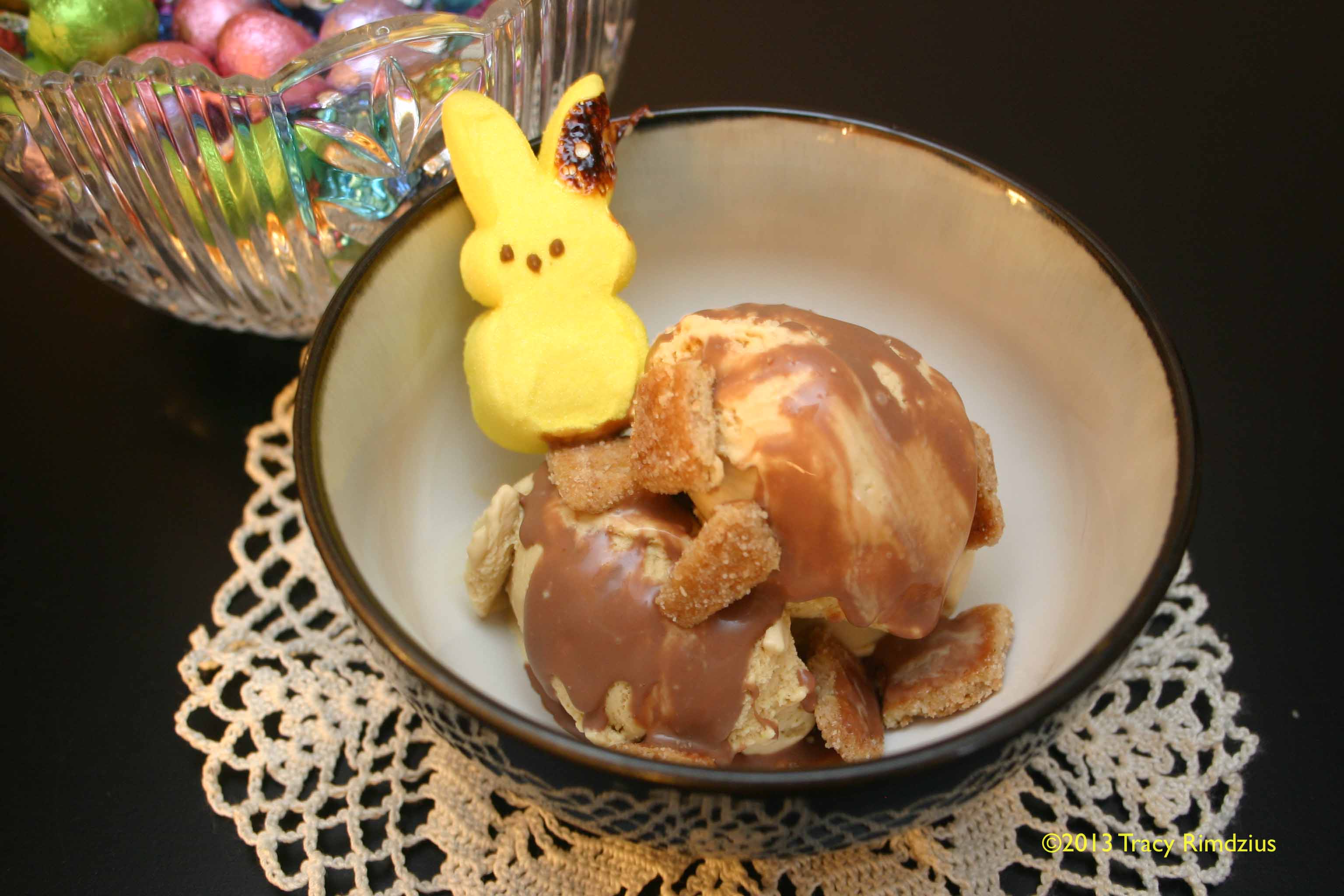 Toasted Peeps ice cream just called for a S’mores treatment, so I served the ice cream with a quick chocolate sauce and caramelized graham cracker pieces. And there you have my Easter dessert for 2013.