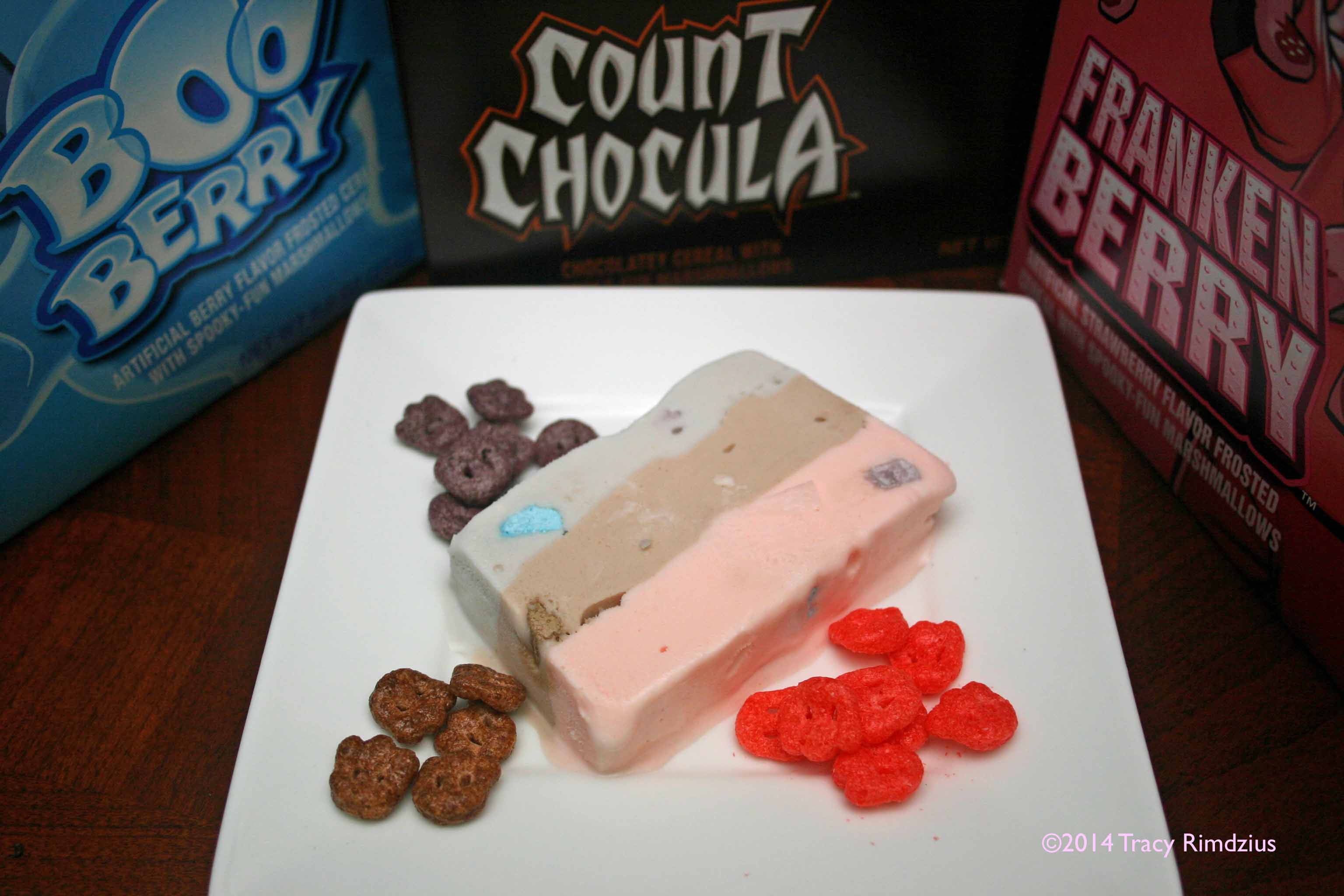 When the seasonal display of monster cereals finally arrived at the grocery store, I excitedly brought them home and proceeded to open them up and try some. This was my first taste of any of them, and I was disappointed. Count Chocula was OK, but neither of the berry flavors tasted like much of anything. By this point, I’d already purchased two boxes of inedible cereal so I decided to go forward anyway…at least the ice cream terrine would look cool (I had envisioned a bright pink layer, a bright blue layer, and a brown layer).
