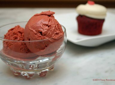 Deep red ice cream with a rich buttery cake flavor and a hint of cocoa. Serve with cream cheese ice cream for a true red velvet cake experience in ice cream!